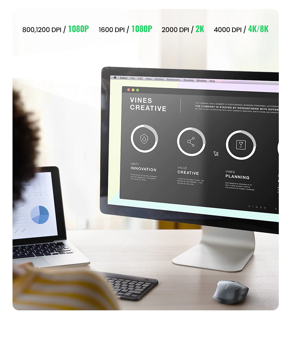 Achieve precise control and smooth navigation with the UGREEN Mouse’s 4000 DPI sensitivity. Whether you’re editing documents, browsing the web, or playing games, you can adjust the DPI settings (800/1200/1600/2000/4000) to suit your preferences and needs.